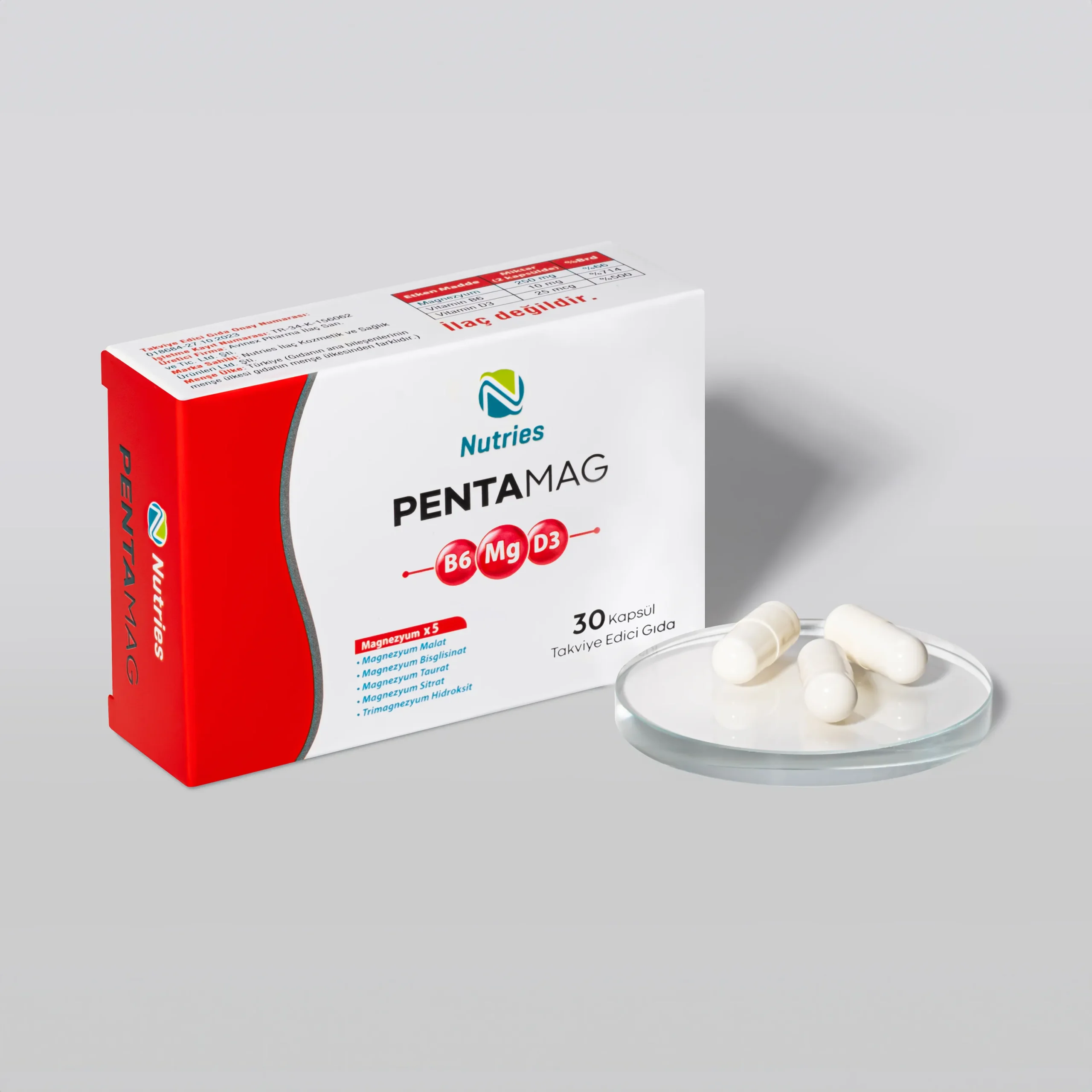 Nutries Pentamag (Beşli Magnezyum kompleksi), içeriğinde Magnezyum Malat, Magnezyum Vigilisinat, Magnezyum Sitrat, Magnezyum Hidroksit ve Magnezyum Taurat bulunan zengin bir takviyedir. Bu kompleks, magnezyumun farklı formlarını bir araya getirerek vücudun ihtiyacını en iyi şekilde karşılamayı hedefler. Magnezyum Malat enerji üretimini destekler, Magnezyum Vigilisinat kas sağlığını ve gevşemeyi sağlar, Magnezyum Sitrat sindirimi düzenler, Magnezyum Hidroksit asit dengesi için önemlidir ve Magnezyum Taurat kalp sağlığını korur.